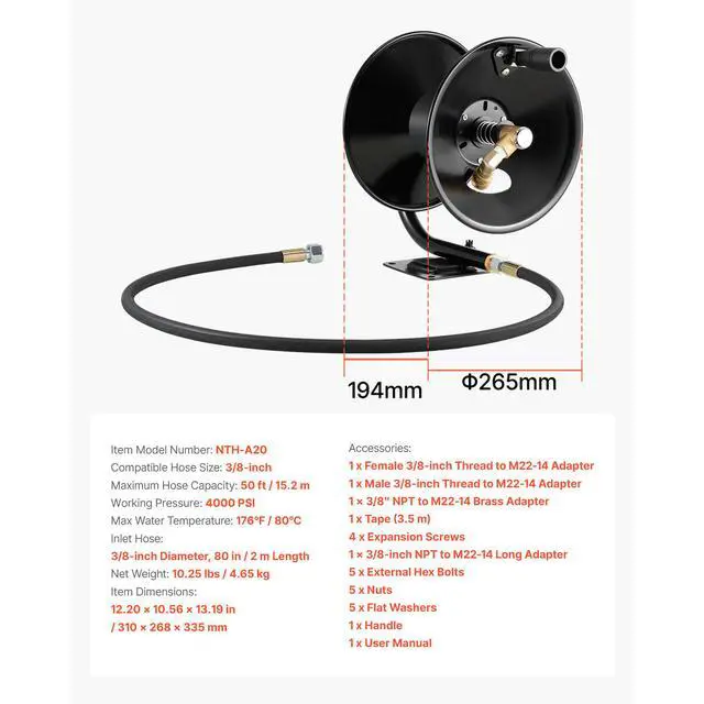 Hose Reel: Not Included,Maximum Working Pressure: 4000 PSI,Hose Temperature Resistance: 176 / 80,Inlet Hose: 3/8-inch Diameter, 80 in / 2 m Length,Item Model Number: NTH-A20,Item Dimensions: 12.20 x 10.56 x 13.19 in / 310 x 268 x 335 mm,Compatible Hose Size: 3/8-inch,Net Weight: 10.25 lbs / 4.65 kg,Main Material: Q235A Steel,Maximum Hose Capacity: 50 ft / 15.2 m