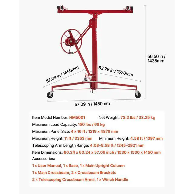 Telescoping Arm Length Range: 4.099.58 ft / 12452921 mm,Color: Red,Item Model Number: HM5001,Maximum Load Capacity: 150 lbs / 68 kg,Maximum Panel Size: 4 x 16 ft / 1219 x 4878 mm,Maximum Height: 11 ft / 3353 mm,Item Dimensions: 60.24 x 60.24 x 57.09 inch / 1530 x 1530 x 1450 mm,Net Weight: 73.3 lbs / 33.25 kg,Main Material: Q235B Steel,Minimum Height: 4.58 ft / 1397 mm