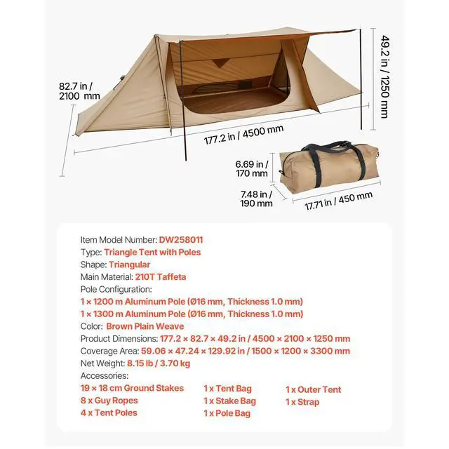1 x 1.2 m Aluminum Pole (Ø16 mm, Thickness 1.0 mm):,1 x 1.3 m Aluminum Pole (Ø16 mm, Thickness 1.0 mm):,Type: Triangle Tent with Poles,Shape: Triangular,Color: Brown Plain Weave,Item Model Number: DW258011,Pole Configuration:,Coverage Area: 1.5 x 1.2 x 3.3 m/59.06 x 47.24 x 129.92 in,Product Dimensions: 3300 × 1500 × 1200 mm / 129.92 × 59.06 × 47.24 in,Net Weight: 3.70 kg/8.15 lb,Main Material: 210T Taffeta
