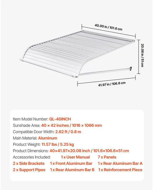 Sunshade Area: 40 × 42 inches (1016 × 1066 mm),Item Model Number: QL-40INCH,Product Weight: 10.80 lbs / 4.9 kg,Product Dimensions: 40 × 42 in / 1016 × 1066 mm,Compatible Door Width: 2.62 ft / 0.8 m,Main Material: Aluminum