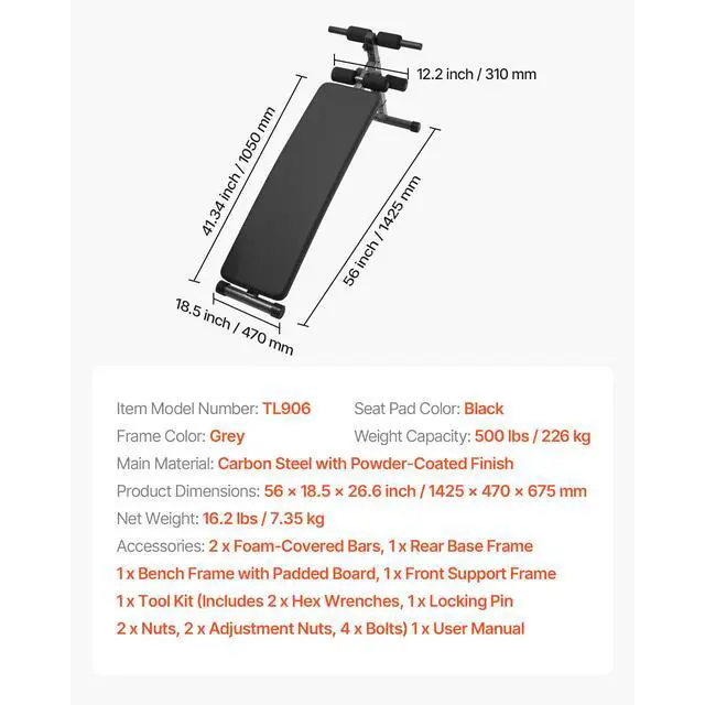 Seat Pad Color: Black,Frame Color: Grey,Item Model NmuberTL906:,Weight Capacity: 500 lbs/226 kg,Pad Dimensions: 41.34 x 12.20 in/1050 x 310 mm,Product Dimensions: 56 x 18.5 x 26.6 in/1425 x 470 x 675 mm,Net Weight: 16.2 lbs/7.35 kg,Main Material: Carbon Steel with Powder-Coated Finish