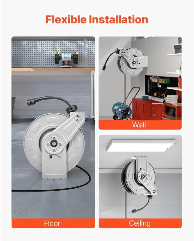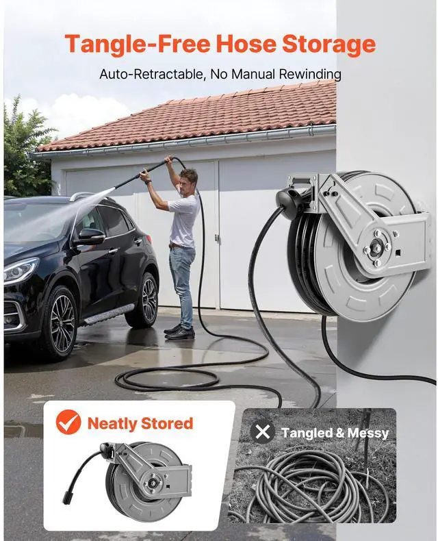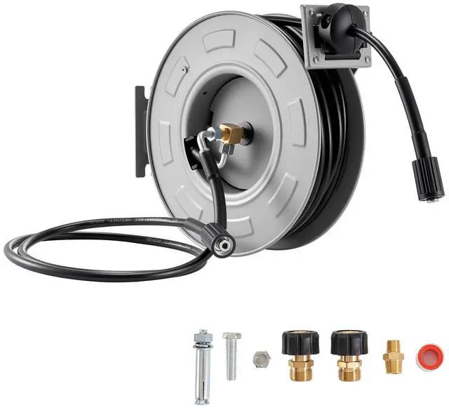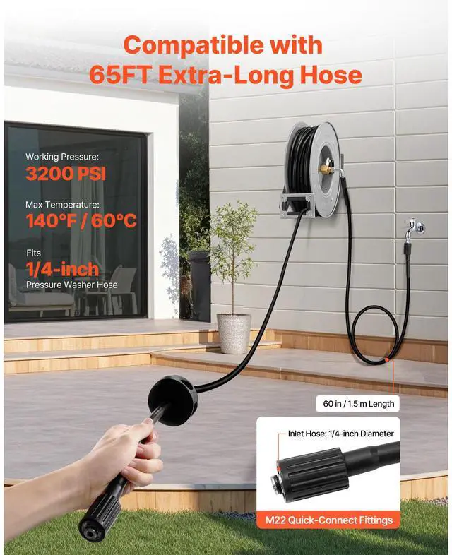 VEVOR Pressure Washer Hose Reel 65ft x 1/4in Retractable 3200PSI Auto-Rewinding