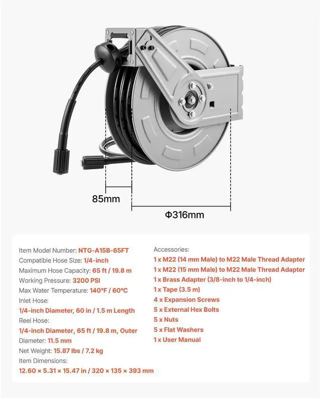 Hose Reel: Included,Max Water Temperature: 140 / 60,Working Pressure: 3200 PSI,Inlet Hose: 1/4-inch Diameter, 60 in / 1.5 m Length,Reel Hose: 1/4-inch Diameter, 65 ft / 19.8 m, Outer Diameter: 11.5 mm,Item Model Number: NTG-A15B,Item Dimensions: 12.60 x 5.31 x 15.47 in / 320 x 135 x 393 mm,Compatible Hose Size: 1/4-inch,Net Weight: 15.87 lbs / 7.2 kg,Main Material: Q235A Steel,Maximum Hose Capacity: 65 ft / 19.8 m