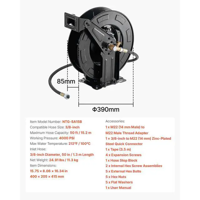 Hose Reel: Not Included,Max Water Temperature: 212 / 100,Working Pressure: 4000 PSI,Inlet Hose: 3/8-inch Diameter, 50 in / 1.3 m Length,Item Model Number: NTG-SA15B,Item Dimensions: 15.75 x 8.06 x 16.34 in / 400 x 205 x 415 mm,Compatible Hose Size: 3/8-inch,Net Weight: 24.91 lbs / 11.3 kg,Main Material: Q235A Steel,Maximum Hose Capacity: 50 ft / 15.2 m