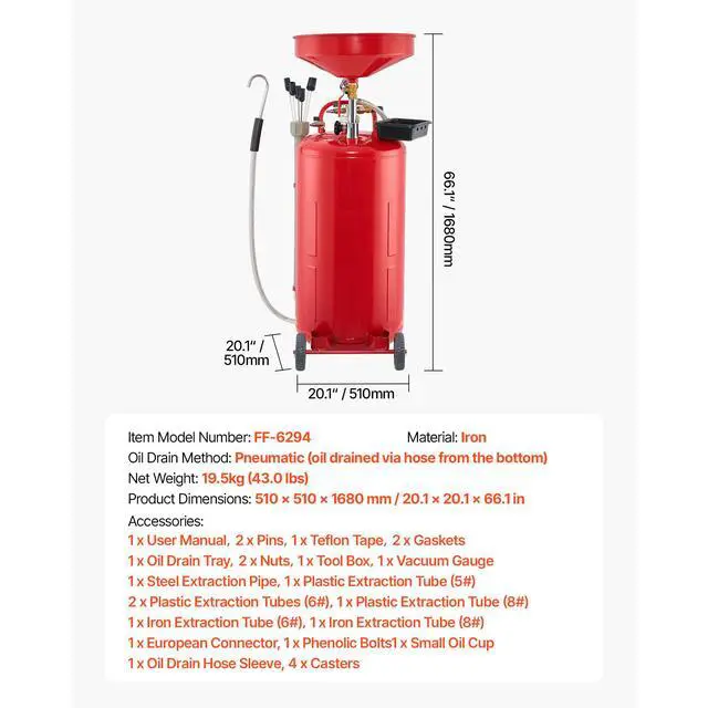 Oil Drain Method: Pneumatic (oil drained via hose from the bottom),Item Model Number: FF-6294,Dimensions: 20.1 x 20.1 x 66.1 in / 510 x 510 x 1680 mm,Material: Iron,Weight: 43.0 lbs / 19.5 kg (with accessories)