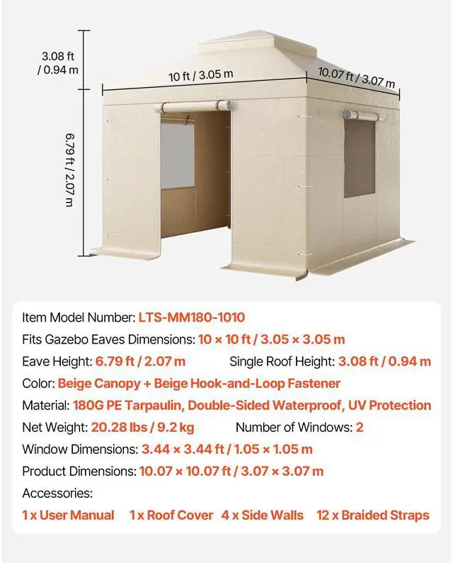 Eave Height: 6.79 ft / 2.07 m,Fits Gazebo Eaves Dimensions: 10 × 10 ft / 3.05 × 3.05 m,Color: Beige Canopy + Beige Hook-and-Loop Fastener,Item Model Number: LTS-MM180-1010,Material: 180G PE Tarpaulin, Double-Sided Waterproof, UV Protection,Window Dimensions: 3.44 × 3.44 ft / 1.05 × 1.05 m,Number of Windows: 2,Product Dimensions: 10.07 × 10.07 ft / 3.07 × 3.07 m,Single Roof Height: 3.08 ft / 0.94 m,Net Weight: 20.28 lbs / 9.2 kg