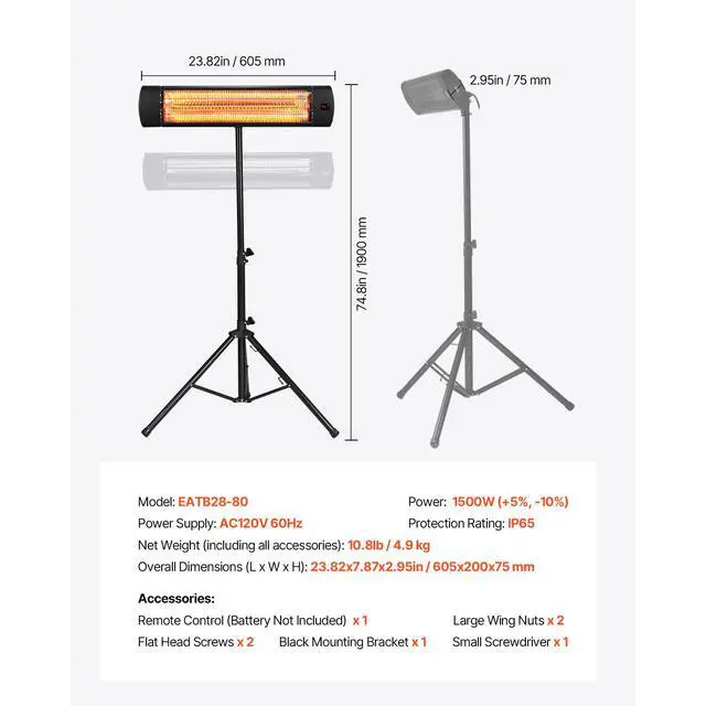 Protection Rating: IP65,Overall Dimensions (L x W x H): 23.82x7.87x2.95in / 605x200x75 mm,Color: Black,Item Model Number: EATB28-80,Net Weight (With All Accessories): 10.8lb / 4.9 kg,Power: 1500W,Main Material: Aluminum Alloy,Power Supply: AC120V 60Hz