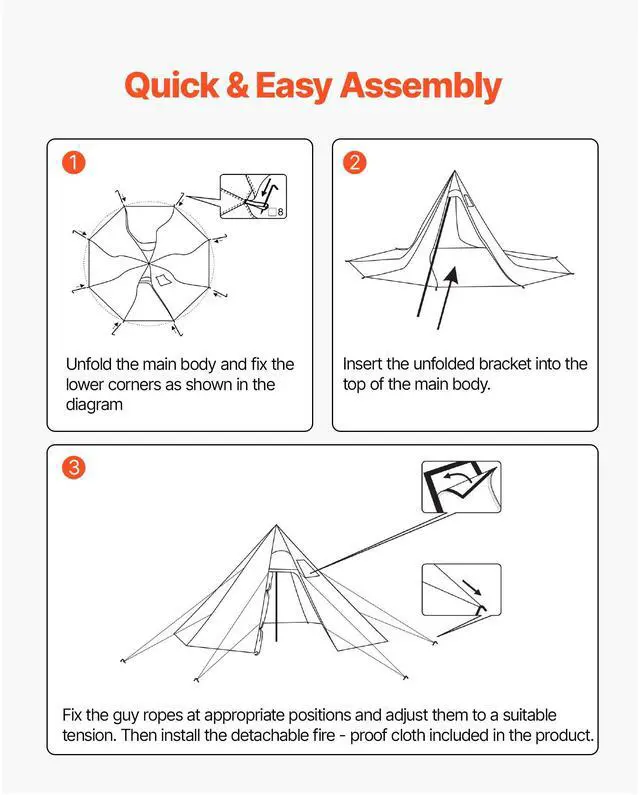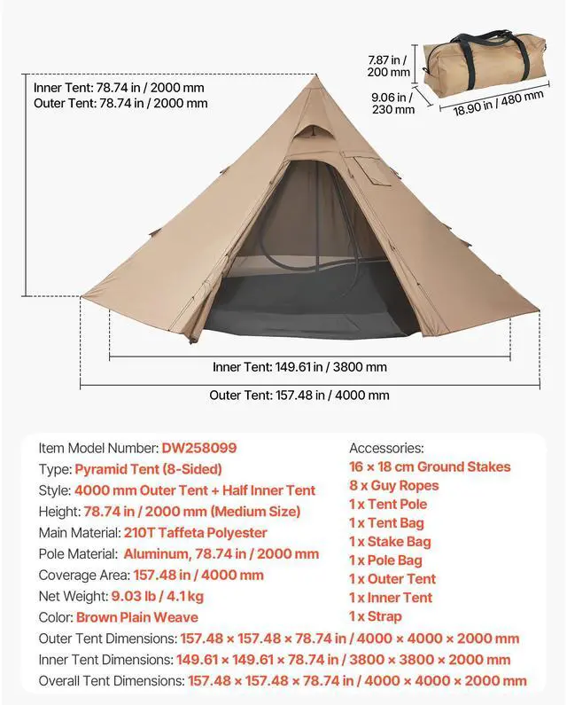 Overall Tent Dimensions: 4000 × 4000 × 2000 mm / 157.48 × 157.48 × 78.74 in,Type: Pyramid Tent (8-Sided),Outer Tent Dimensions: 4600 × 4600 × 2600 mm / 181.10 × 181.10 × 102.36 in,Pole Material: Aluminum, 2 m / 78.74 in,Color: Brown Plain Weave,Item Model Number: DW258099,Style: 2 m Outer Tent + Half Inner Tent,Height: 2 m / 78.74 in (Medium Size),Coverage Area: 4 m/ 157.48 in,Net Weight: 4.1kg/9.03 lb,Main Material: 210T Taffeta Polyester,Inner Tent Dimensions: 3800 × 3800 × 2000 mm / 149.61 × 149.61 × 78.74 in