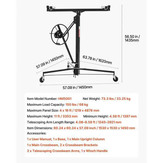 Telescoping Arm Length Range: 4.099.58 ft / 12452921 mm,Color: Black,Item Model Number: HM5001,Maximum Load Capacity: 150 lbs / 68 kg,Maximum Panel Size: 4 x 16 ft / 1219 x 4878 mm,Maximum Height: 11 ft / 3353 mm,Item Dimensions: 60.24 x 60.24 x 57.09 inch / 1530 x 1530 x 1450 mm,Net Weight: 73.3 lbs / 33.25 kg,Main Material: Q235B Steel,Minimum Height: 4.58 ft / 1397 mm