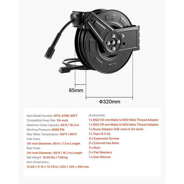 Hose Reel: Included,Max Water Temperature: 140 / 60,Working Pressure: 4000 PSI,Inlet Hose: 1/4-inch Diameter, 60 in / 1.5 m Length,Reel Hose: 1/4-inch Diameter, 60 ft / 18.3 m Length,Item Model Number: NTG-A15B,Item Dimensions: 12.80 x 5.12 x 13.78 in / 325 x 130 x 350 mm,Compatible Hose Size: 1/4-inch,Net Weight: 16.93 lbs / 7.68 kg,Main Material: Q235A Steel,Maximum Hose Capacity: 60 ft / 18.3 m