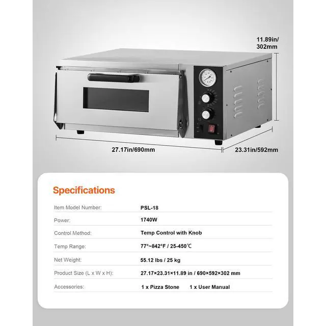 Control Method: Temp Control with Knob,Item Model Number: PSL-18,Net Weight: 55.12 lbs / 25 kg,Power: 1740W,Temp Range: 77-842°F / 25-450