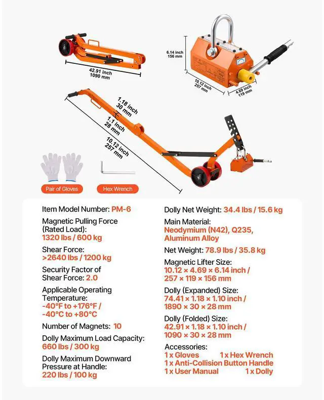 Dolly Net Weight: 34.4 lbs / 15.6 kg,Security Factor of Shear Force: 2.0,Dolly Maximum Load Capacity: 660 lbs / 300 kg,Magnetic Pulling Force (Rated Load): 1320 lbs / 600 kg,Dolly (Expanded) Size: 74.41 x 1.18 x 1.10 inch / 1890 x 30 x 28 mm,Shear Force: >2640 lbs / 1200 kg,Dolly Maximum Downward Pressure at Handle: 220 lbs / 100 kg,Dolly (Folded) Size: 42.91 x 1.18 x 1.10 inch / 1090 x 30 x 28 mm,Item Model Number: PM-6,Magnetic Lifter Size: 10.12 x 4.69 x 6.14 inch / 257 x 119 x 156 mm,Applicable Operating Temperature: -40 to +176 / -40 to +80,Net Weight: 78.9 lbs / 35.8 kg,Number of Magnets: 10,Main Material: Neodymium (N42), Q235, Aluminum Alloy