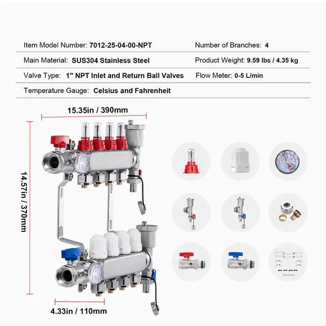 Temperature Gauge: Celsius and Fahrenheit,Flow Rate: 0-5L/min,Valve Type: 1" NPT Inlet and Return Ball Valves,Item Model Number: 7012-25-04-00-NPT,Product Weight: 9.59 lbs / 4.35 kg,Number of Branches: 4,Product Dimensions: 15.35 x 14.57 x 4.33 in / 390 x 370 x 110 mm,Main Material: SUS304 Stainless Steel