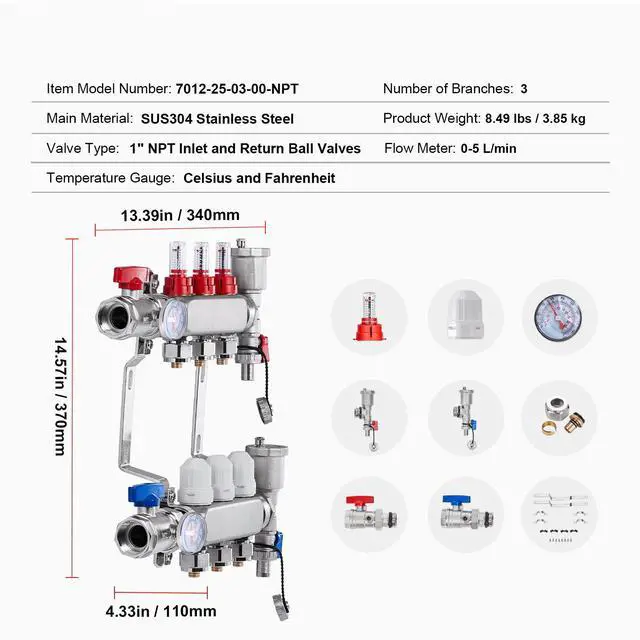 Temperature Gauge: Celsius and Fahrenheit,Flow Rate: 0-5L/min,Valve Type: 1" NPT Inlet and Return Ball Valves,Item Model Number: 7012-25-03-00-NPT,Product Weight: 8.49 lbs / 3.85 kg,Number of Branches: 3,Product Dimensions: 13.39 x 14.57 x 4.33 in / 340 x 370 x 110 mm,Main Material: SUS304 Stainless Steel