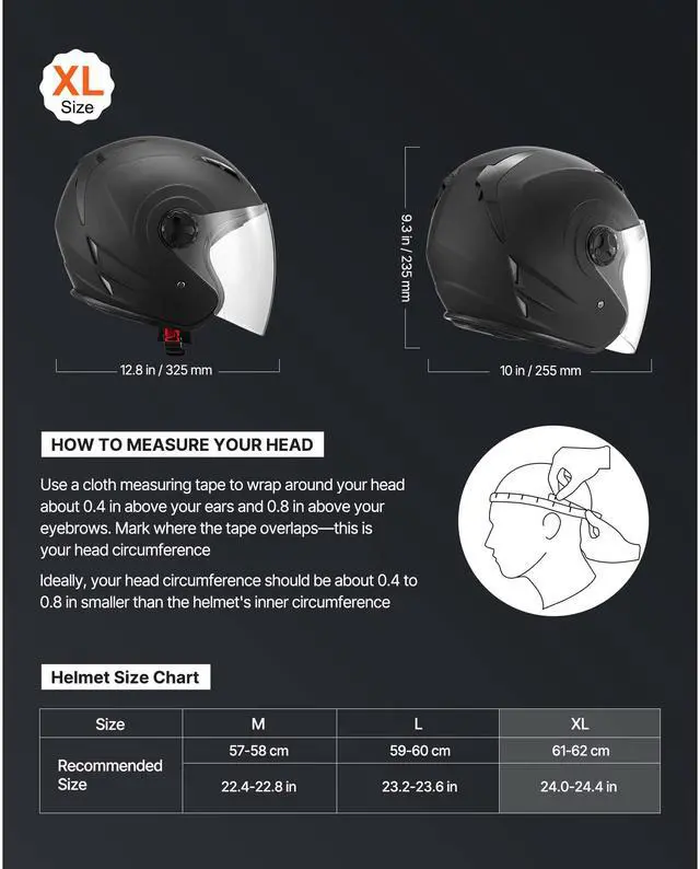 Product Dimension: 12.8 x 10.0 x 9.3 in/325 x 255 x 235 mm,Size: 3/4-Face Helmet-Size XL,Item Model Number: WLT-169,Helmet Size: 24.0-24.4 in/61-62 cm,Net Weight: 2.2 lbs/0.98 kg(Include all accessories)