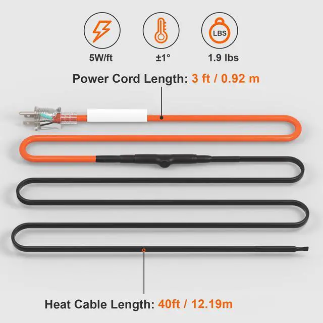 Self-Regulating Pipe Heating Cable 40FT 5W/FT Heat Tape with Thermostat