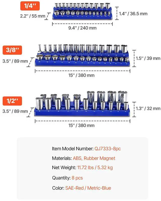 14.96'' × 3.50'' × 1.53'' / 380 x 89 x 39 mm (3/8 Sizes):,9.44'' × 2.16'' × 1.43'' / 240 x 55 x 36.5 mm (1/4 Sizes):,Materials: ABS, Rubber Magnet,Color: Blue for Metric, Red for SAE,Item Model Number: QJ7333-8pc,Quantity: 8 pcs, Metric & SAE,14.96'' × 3.50'' × 1.25'' / 380 x 89 x 32 mm (1/2 Sizes):,Product Dimensions:,Net Weight: 11.72 lbs / 5.32 kg