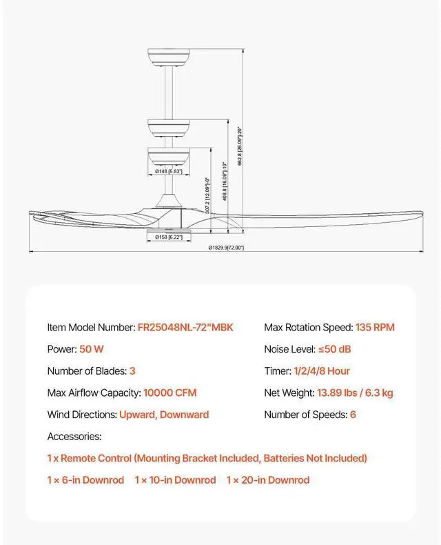 Product Dimensions(10-in Downrod): 70.87 x 16.09"/1800 x 408.6 mm,Product Dimensions(20-in Downrod): 70.87 x 26.09"/1800 x 662.8 mm,Color: Black,Max Airflow Capacity: 10000 CFM,Product Dimensions(6-in Downrod): 70.87 x 12.09"/1800 x 307.2 mm,Number of Speeds: 6,Wind Directions: Upward, Downward,Noise Level: 50 dB,Timer: 1/2/4/8 Hour,Max Rotation Speed: 135 RPM,Item Model Number: FR25048NL-72"MBK,Number of Blades: 3,Net Weight: 13.89 lbs / 6.3 kg,Power: 30 W