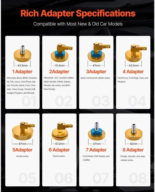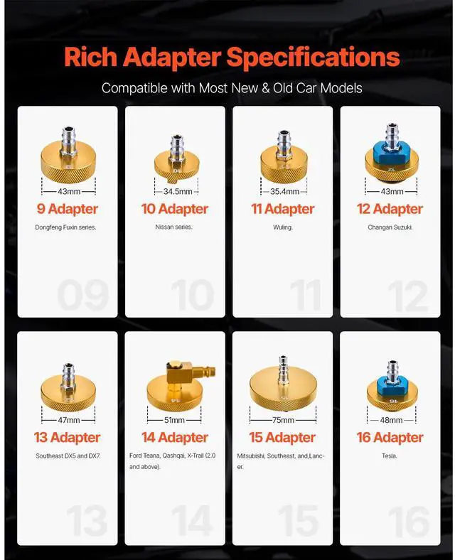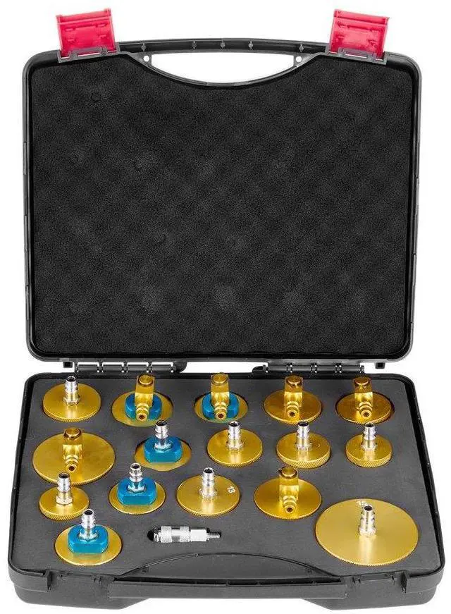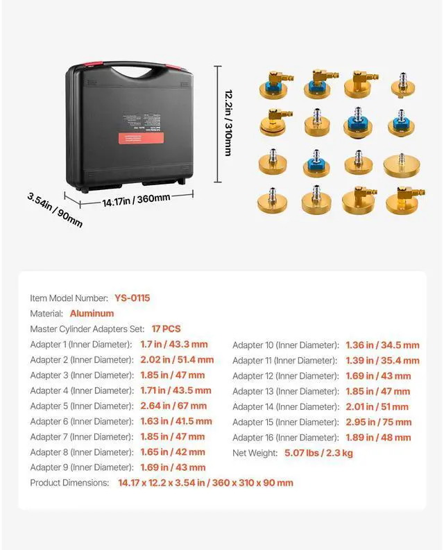 Adapter 10 (Inner Diameter): 1.36 in / 34.5 mm,Adapter 1 (Inner Diameter): 1.7 in / 43.3 mm,Adapter 8 (Inner Diameter): 1.65 in / 42 mm,Adapter 12 (Inner Diameter): 1.69 in / 43 mm,Adapter 3 (Inner Diameter): 1.85 in / 47 mm,Adapter 6 (Inner Diameter): 1.63 in / 41.5 mm,Adapter 15 (Inner Diameter): 2.95 in / 75 mm,Material: Aluminum,Product Dimensions: 14.17 x 12.2 x 3.54 in / 360 x 310 x 90 mm,Adapter 16 (Inner Diameter): 1.89 in / 48 mm,Adapter 7 (Inner Diameter): 1.85 in / 47 mm,Adapter 2 (Inner Diameter): 2.02 in / 51.4 mm,Adapter 11 (Inner Diameter): 1.39 in / 35.4 mm,Adapter 14 (Inner Diameter): 2.01 in / 51 mm,Adapter 5 (Inner Diameter): 2.64 in / 67 mm,Item Model Number: YS-0115,Adapter 4 (Inner Diameter): 1.71 in / 43.5 mm,Adapter 13 (Inner Diameter): 1.85 in / 47 mm,Adapter 9 (Inner Diameter): 1.69 in / 43 mm,Master Cylinder Adapters Set: 17 PCS,Net Weight: 5.07 Ibs / 2.3 kg