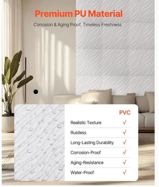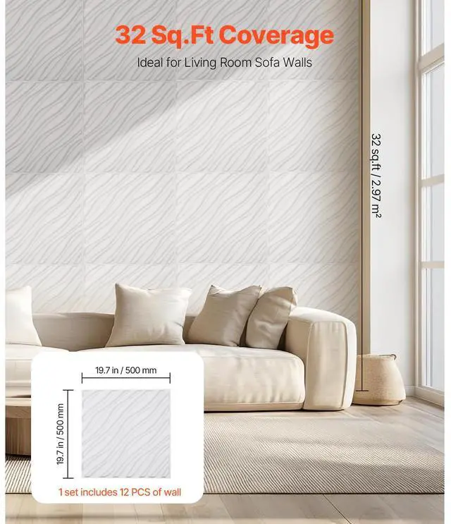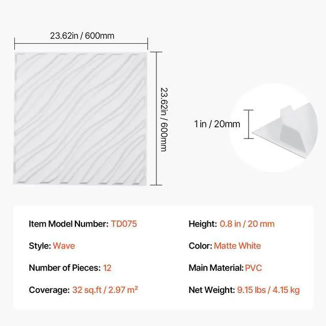 Number of Pieces: 12,Color: Matte White,Item Model Number: TD075,Style: Wave,Coverage: 32 sq.ft / 2.97 m²,Height: 0.8 in / 20 mm,Product Dimensions(L x W x H): 19.7 x 19.7 x 0.8 in / 500 x 500 x 20 mm,Net Weight: 9.15 lbs / 4.15 kg,Main Material: PVC