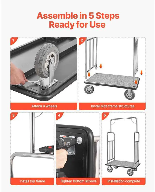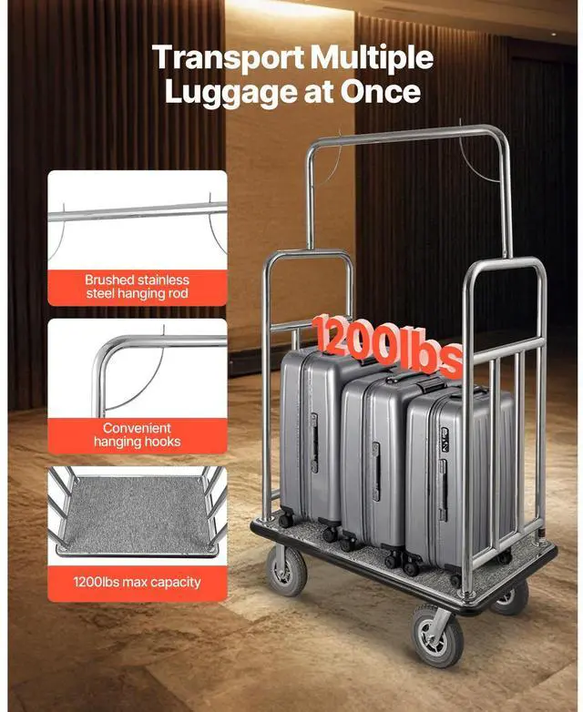 VEVOR Hotel Luggage Cart 1200 LBS Brushed Stainless Steel Finish Bellman's Cart