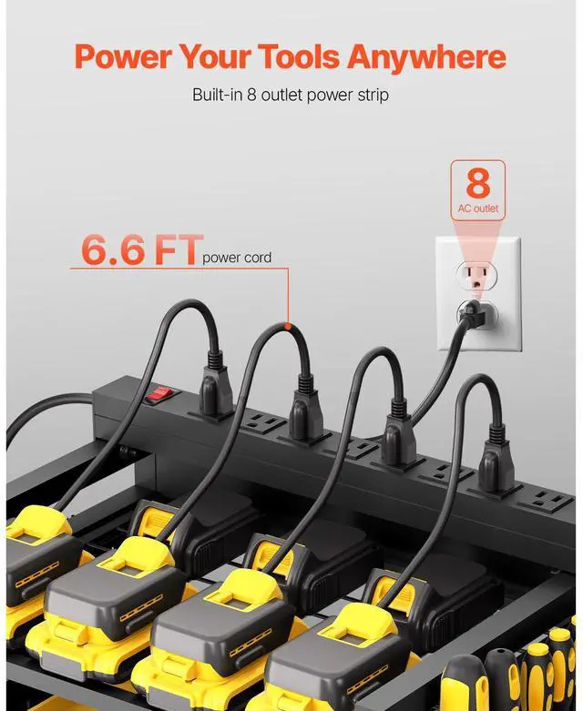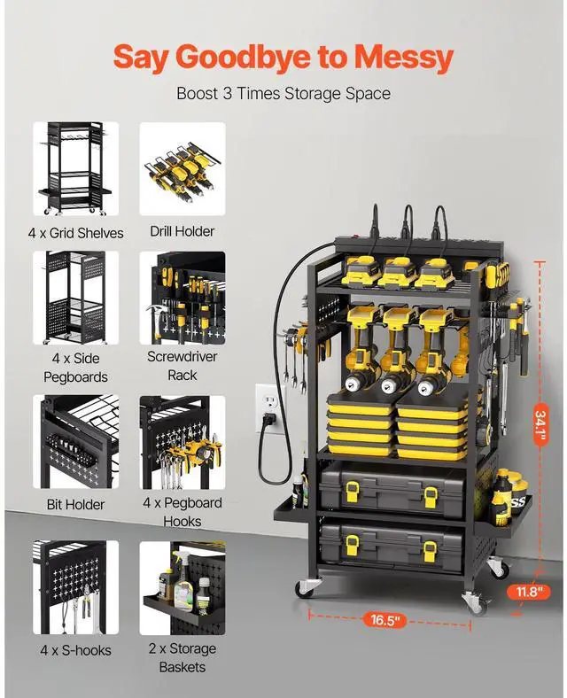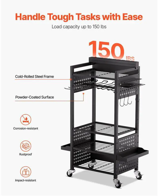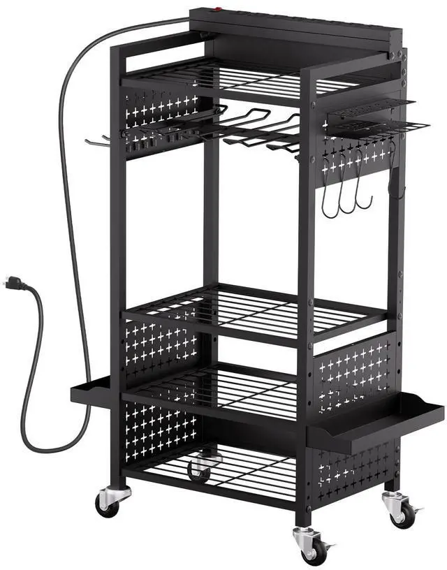 Power Strip Cord Length: 6.6 ft / 2 m,Power Tool Rack Capacity: 30 lbs / 13.6 kg,Power Strip Rating: 15A 125V 60Hz, Max. 1875W,Color: Black,Total Load Capacity: 150 lbs / 68 kg,Per Shelf Load Capacity: 40 lbs / 18.1 kg,1/4 Pegboard Panel Dimensions: 5.3 x 10.2 in / 135 x 260 mm,Wheels Quantity: 4 swivel casters (2 with brakes),Number of Tiers: 5,Overall Product Size: 16.5 x 11.8 x 34.1 in / 420 x 300 x 865 mm (Height includes casters; width excludes accessories),Item Model Number: ETT02,Product Weight: 19.4 lbs / 8.8 kg,Half Pegboard Panel Dimensions: 10.6 x 10.2 in / 270 x 260 mm