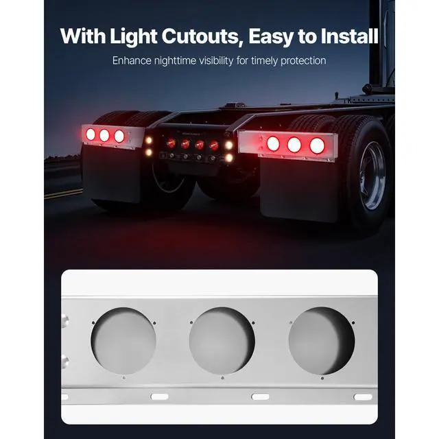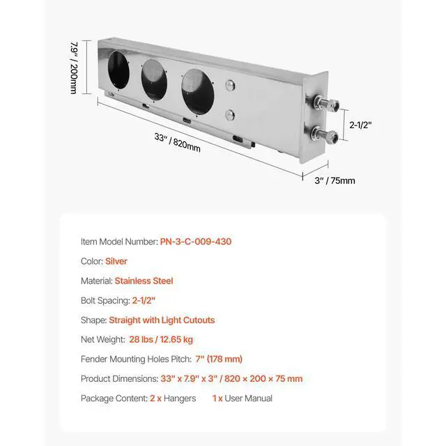 Fender Mounting Holes Pitch: 7"/ 178 mm,Shape: Straight with Light Cutouts,Color: Silver,Item Model Number: PN-3-C-009-430,Material: Stainless Steel,Bolt Spacing: 2-1/2",Net Weight: 28 lbs / 12.65 kg,Product Size: 33" x 7.9" x 3" / 820 x 200 x 75 mm