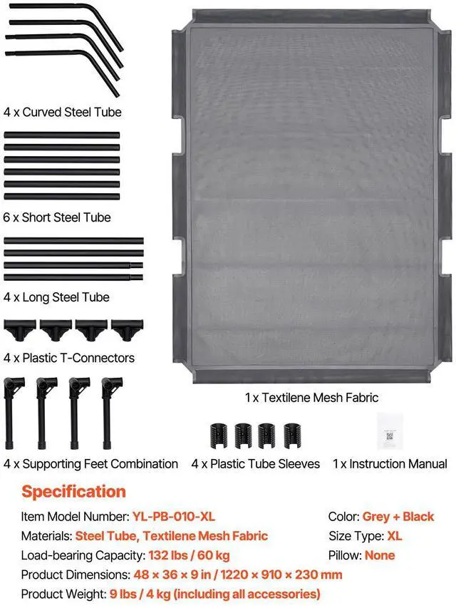 Size Type: XL,Load-bearing Capacity: 132 lbs / 60 kg,Color: Grey + Black,Materials: Steel Tube, Textilene Mesh Fabric,Item Model Number: YL-PB-010-XL,Product Weight: 9 lbs / 4 kg (including all accessories),Product Dimensions: 48 in x 36 x 9 in / 1220 x 910 x 230 mm,Pillow: None
