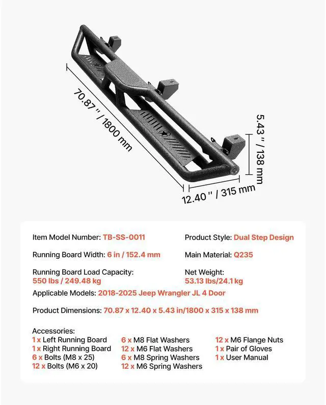 Running Board Load Capacity: 550 lbs/ 249.48 kg