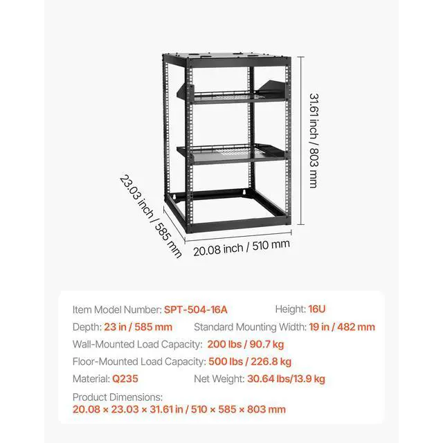 Item Model Number: SPT-504-16A,Standard Mounting Width: 19 in/482 mm,Wall-Mounted Load Capacity: 200 lbs/90.7 kg,Height: 16U,Floor-Mounted Load Capacity: 500 lbs/226.8 kg,Material: Q235,Depth: 23 in/585 mm