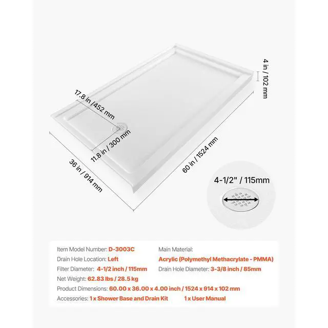 Drain Hole Location: Left,Drain Hole Diameter: 3-3/8 inch / 85mm,Item Model Number: D-3003C,Filter Diameter: 4-1/2 inch / 115mm,Product Dimensions: 60.00 x 36.00 x 4.00 inch / 1524 x 914 x 102 mm,Net Weight: 62.83 lbs / 28.5 kg,Main Material: Acrylic (Polymethyl Methacrylate - PMMA)