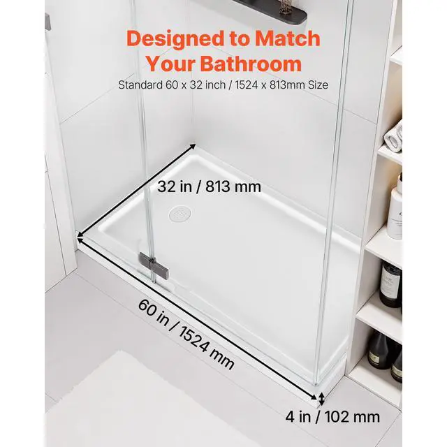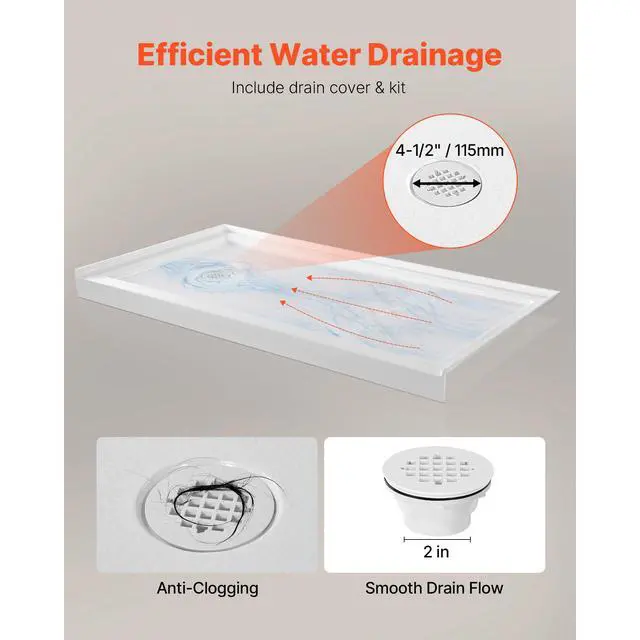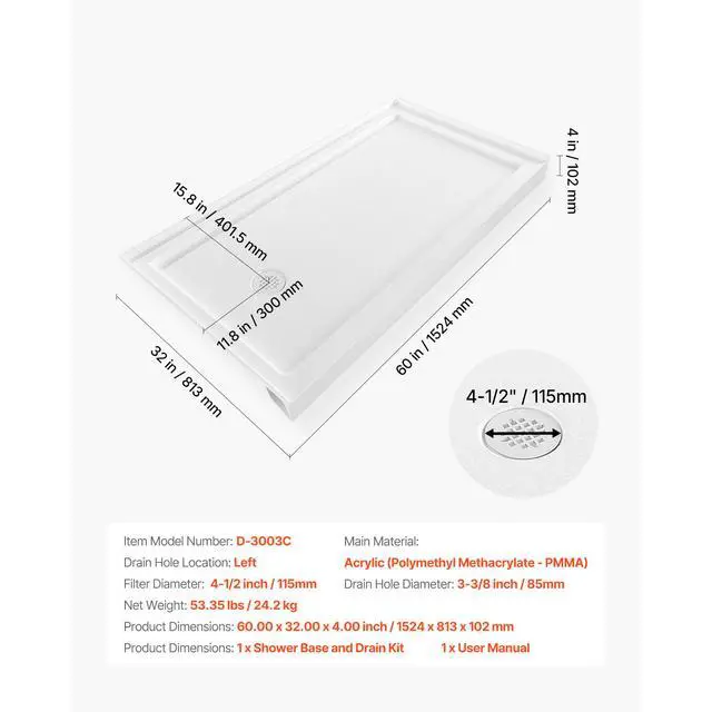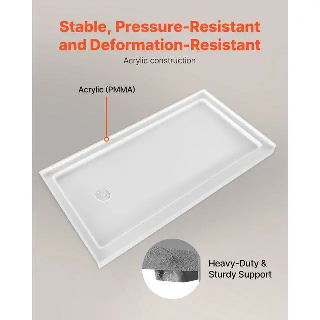 VEVOR Shower Pan 60 L x 32 W Single Threshold Shower Base Left Drain Location