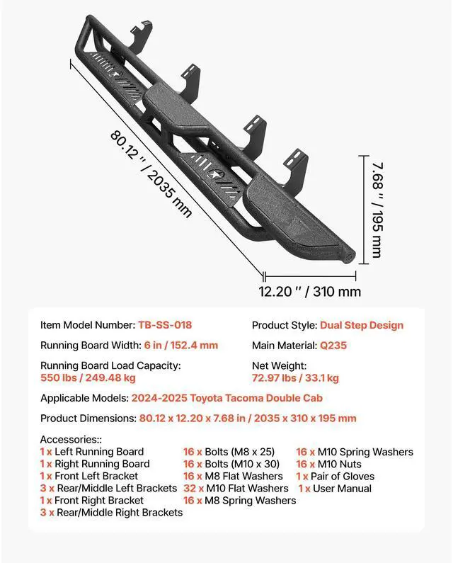 Running Board Load Capacity: 550 lbs/ 249.48 kg