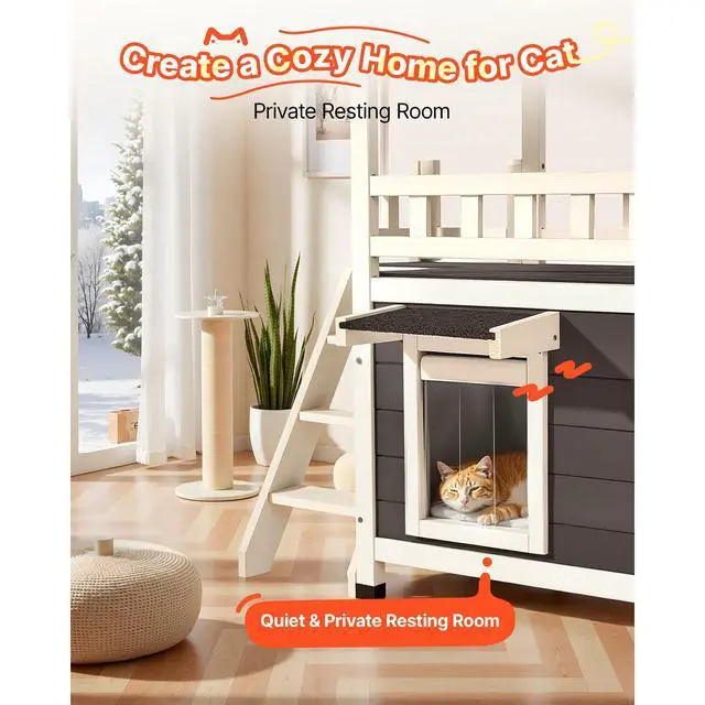 VEVOR Outdoor Cat House 2-Story Wooden Feral Cat Shelter with Stairs & Balcony