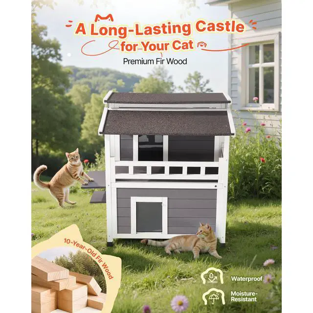 VEVOR Insulated Cat House 2-Story Outdoor Wooden Feral Cat Shelter with Balcony