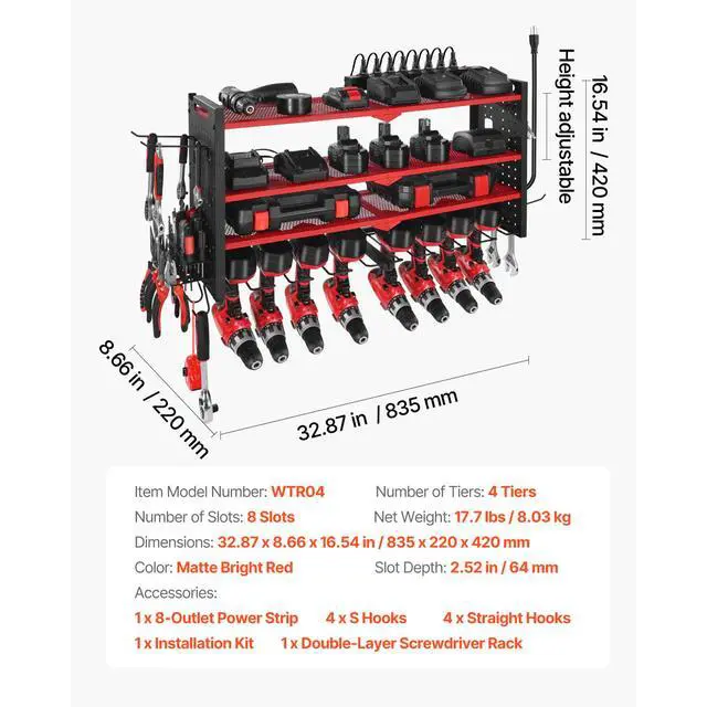 Number of Tiers: 3 Tiers,Main Slot Depth: 6.5 in / 165 mm,Color: Red,Item Model Number: WTR02,Dimensions: 23.31 x 8.66 x 12.01 in / 592 x 220 x 305 mm,Side Slot Depth: 4.84 in / 123 mm,Net Weight: 8.71 lbs / 3.95 kg,Number of Slots: 4 Slots