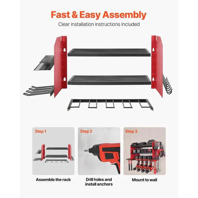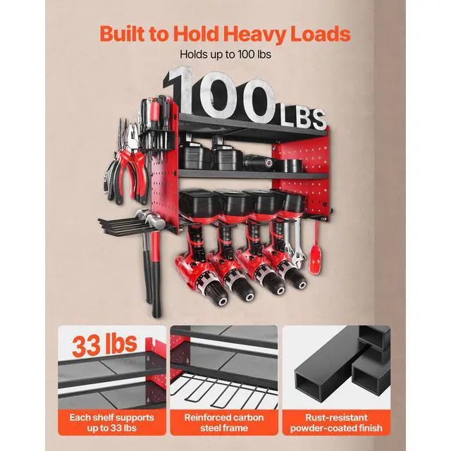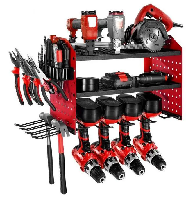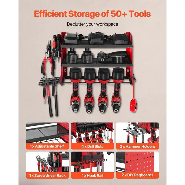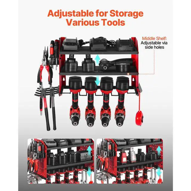 VEVOR Power Tool Organizer Wall Mount 3-Layer Drill Storage Rack 4 Drill Holders