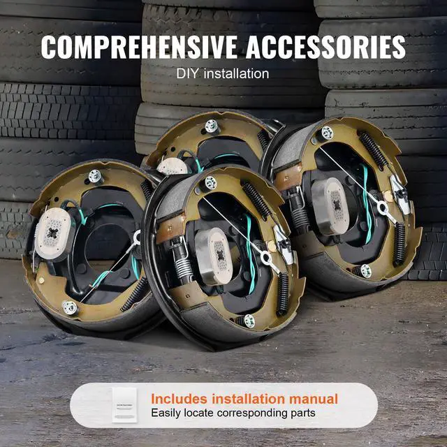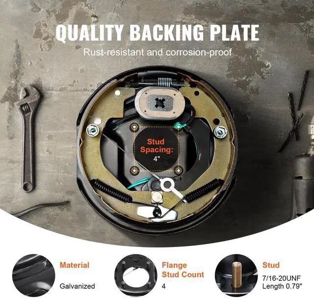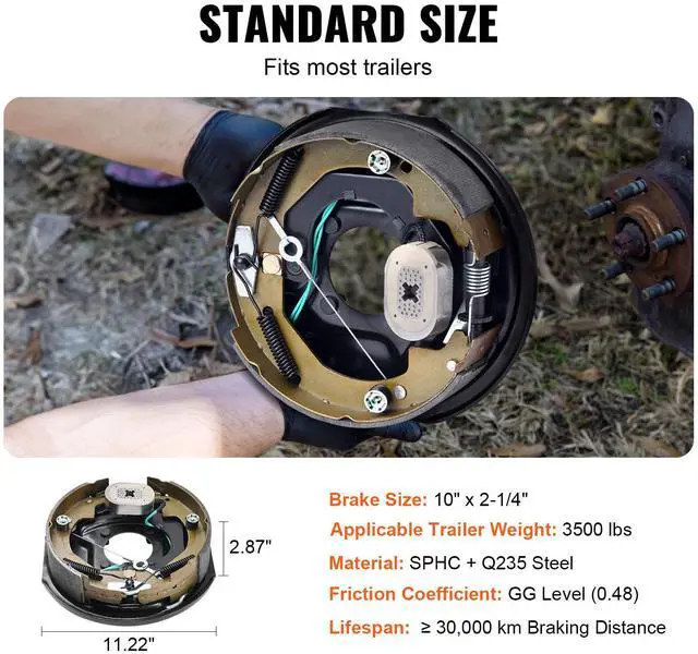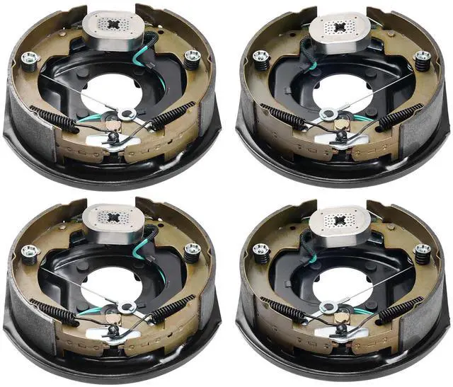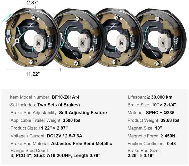 Set Includes: Two Sets (4 Brakes),Material: SPHC + Q235,Brake Pad Adjustability: Self-Adjusting Feature,Magnetic Force: 450N,Applicable Trailer Weight: 3500 lbs,Magnet Size: 10",Friction Coefficient: 0.48,Brake Size: 10" x 2-1/4",Product Size: 11.22" x 2.87",Flange Stud Count: 4,Item Model Number: BF10-Z01A*4,Product Weight: 39.68 lbs,Lifespan: 30,000 km,Voltage/Current: DC12V/2.5-3.6A,Brake Pad Material: Asbestos-Free Semi-Metallic,Brake Pad Size: 2.26" x 0.19"