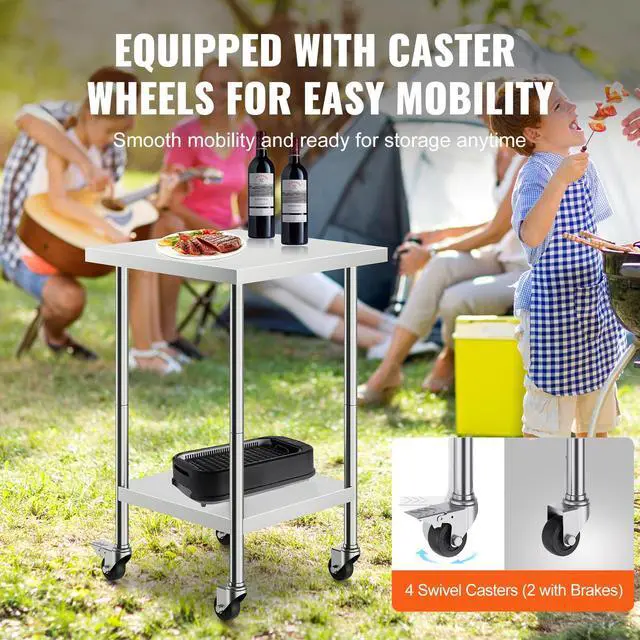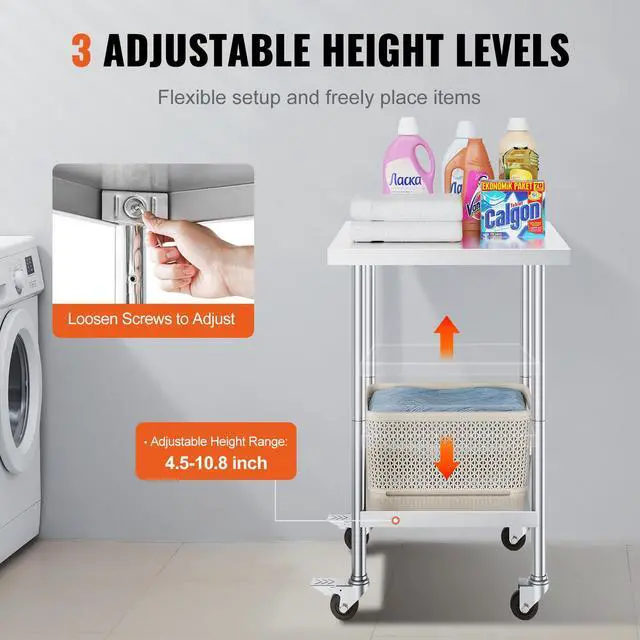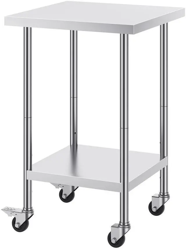 VEVOR Stainless Steel Work Table 24 x 24 x 38 Inch, 700 LBS Load Capacity with 4 Wheels, 3 Adjustable Height Levels, Heavy Duty Food Prep Worktable for Commercial Kitchen Restaurant, Silver