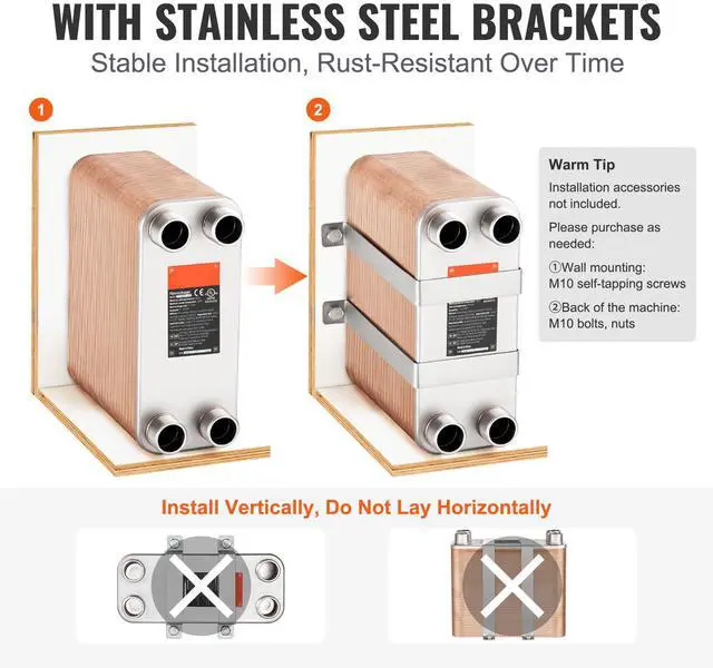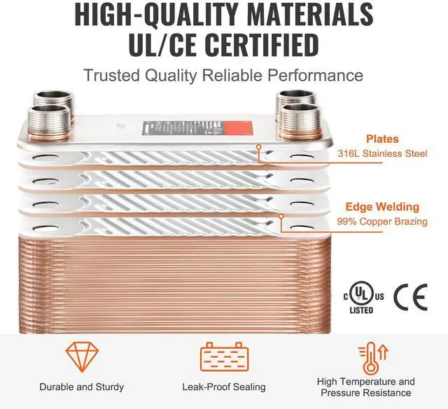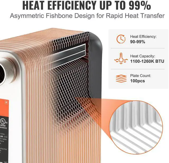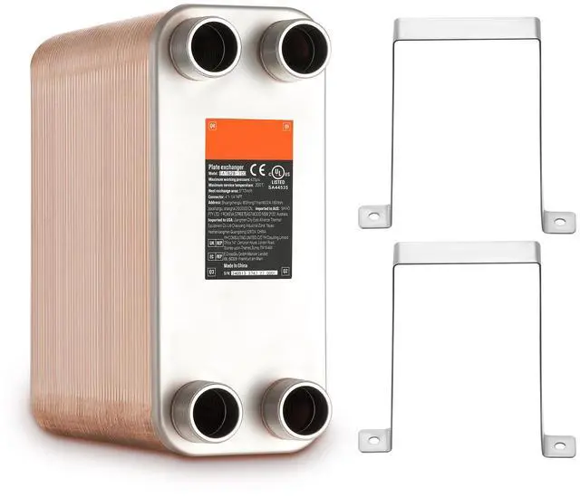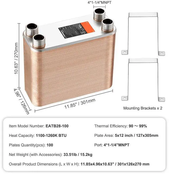 Plate Area: 5x12 inch/ 127x305mm,Heat Capacity: 1100-1260K BTU,Port: 4*1-1/4" MNPT External Thread,Color: Stainless Steel + Copper Color,Model: EATB28-100,Thermal Efficiency: 9099%,Material: 304/316 Stainless Steel, Solder: 99.9% Copper Brazing,Plates Quantity(pcs): 100,Product Dimensions (L x W x H): 11.85x4.96x9.69in / 301x126x246 mm,Net Weight (with Accessories): 33.51lb / 15.2kg