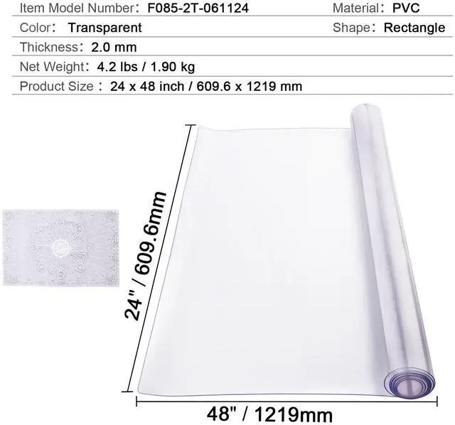 Item Model Number: F085-2T-061124 Material: PVC Color: Transparent Thickness: 2.0 mm Shape: Rectangle Table Protector Size: 24x48 inch / 609.6 x1219mm Net Weight: 4.2 lbs / 1.9 kg
