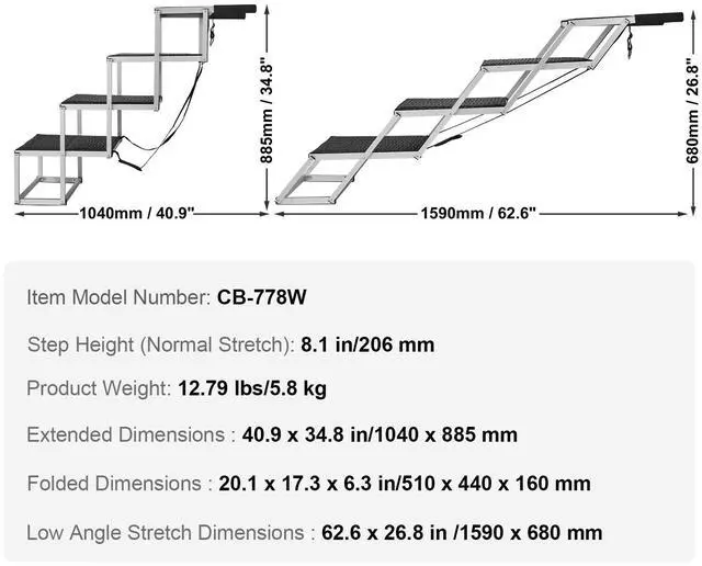 Step Height (Extended): 8.1 in/206 mm,Item Model Number: CB-778W,Product Weight: 12.79 lbs/5.8 kg,Low Angle Extended Dimensions: 62.6 x 26.8 in /1590 x 680 mm,Extended Dimensions: 40.9 x 34.8 in/1040 x 885 mm,Folded Dimensions: 20.1 x 17.3 x 6.3 in/510 x 440 x 160 mm