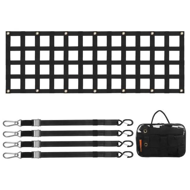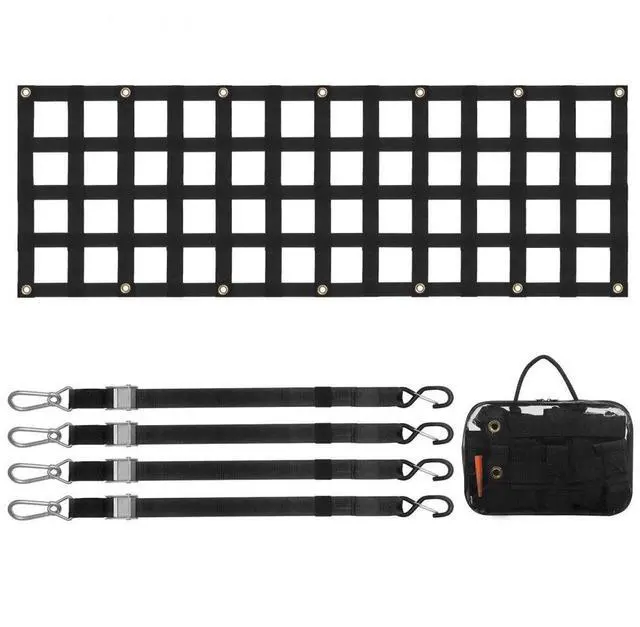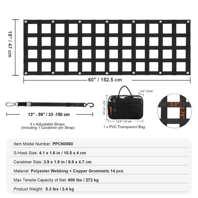 S-Hook Size: 4.1 x 1.6 in / 105 x 40 mm,Adjustable Strap Size: 13 - 59 in / 330 - 1500 mm,Carabiner Size: 3.9 x 1.9 in / 99 x 47 mm,Max Tensile Capacity of Net: 600 lbs / 272 kg,Tailgate Net Size: 60 x 18 in / 1525 x 470 mm,Hole Size: 3.3 x 2.76 in / 85 x 70 mm,Item Model Number: PPCN0060,Product Weight: 5.3 lbs / 2.4 kg,Material: PP Webbing + Copper Grommets 14 pcs,Product Dimensions: 59.4 x 18.5 x 0.3 in / 1510 x 470 x 7.5 mm (Fully Expanded)