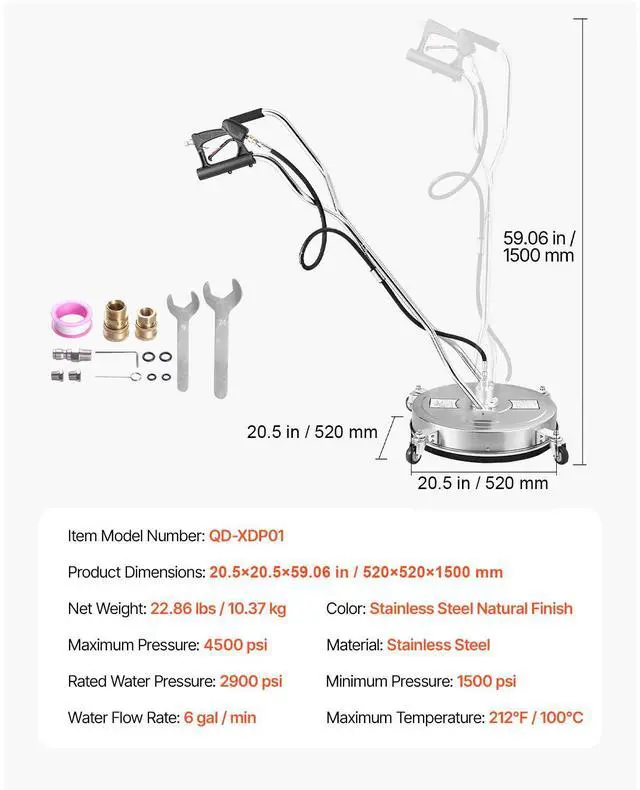 Water Flow Rate: 6 gal/min,Color: Stainless Steel Natural Finish,Item Model Number: QD-XDP01,Material: Stainless Steel,Minimum Pressure: 1500 psi,Product Dimensions: 20.5 x 20.5 x 59.06 inch / 520 x 520 x 1500 mm,Maximum Temperature: 212 / 100,Net Weight: 22.86 lbs / 10.37 kg,Maximum Pressure: 4000 psi,Rated Water Pressure: 2900 psi
