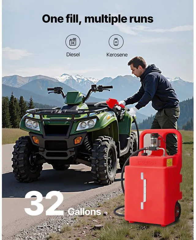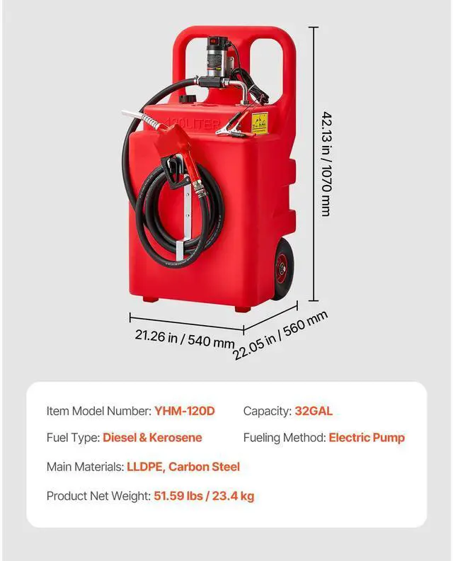 Main Materials: LLDPE, Carbon Steel,Capacity: 32GAL,Item Model Number: YHM-120D,Product Net Weight: 51.59 lbs/23.4kg,Product Dimensions: 21.26 x 18.31 x 42.13 in/540 x 465 x 1070mm (only the tank),Fueling Method: Electric Pump,Fuel Type: Diesel & Kerosene