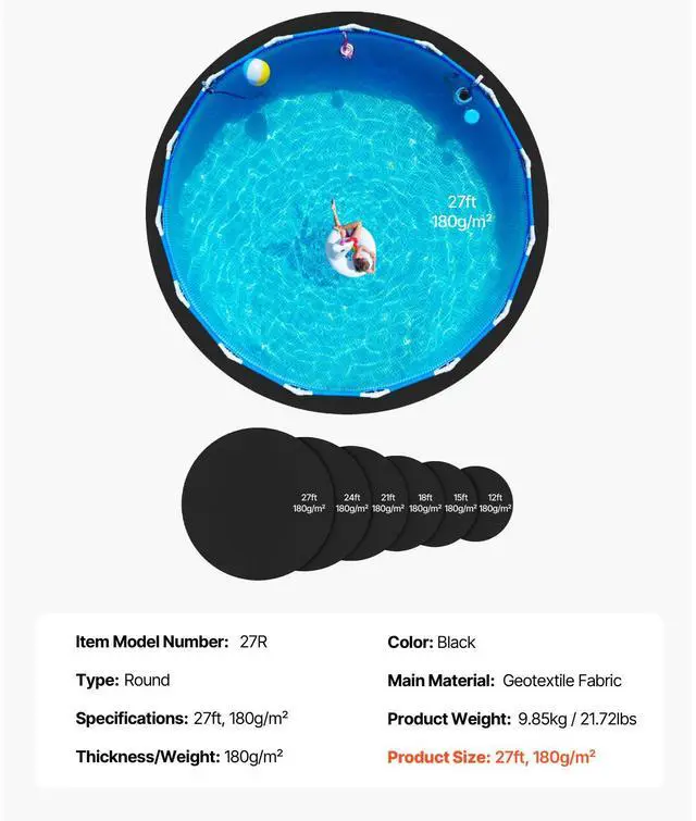 Type: Round,Thickness/Weight: 180g/m²,Specifications: 27ft, 180g/m²,Color: Black,Item Model Number: 27R,Product Weight: 9.85kg / 21.72lbs,Main Material: Geotextile Fabric,Product Size: 27ft, 180g/m²