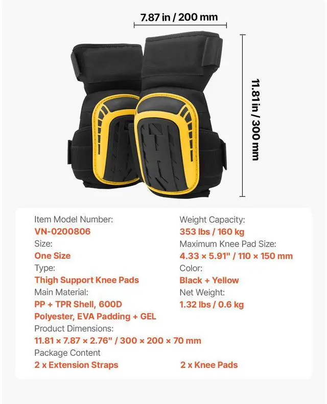 Type: Extended Length,Weight Capacity: 353 lbs / 160 kg,Maximum Knee Pad Size: 4.33 x 5.91" / 110 x 150 mm,Size: Adult One Size (Large),Color: Black + Yellow,Item Model Number: VN-0161701,Product Dimensions: 11.81 x 7.87 x 2.76" / 300 x 200 x 70 mm,Net Weight: 1.32 lbs / 0.6 kg,Main Material: PP + TPR Plastic Shell, 600D Polyester, EVA Lining + GEL