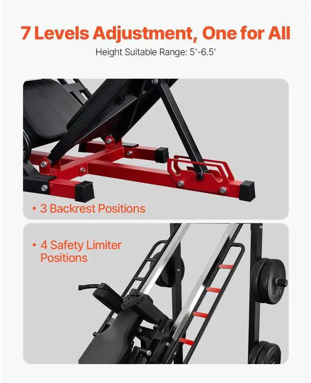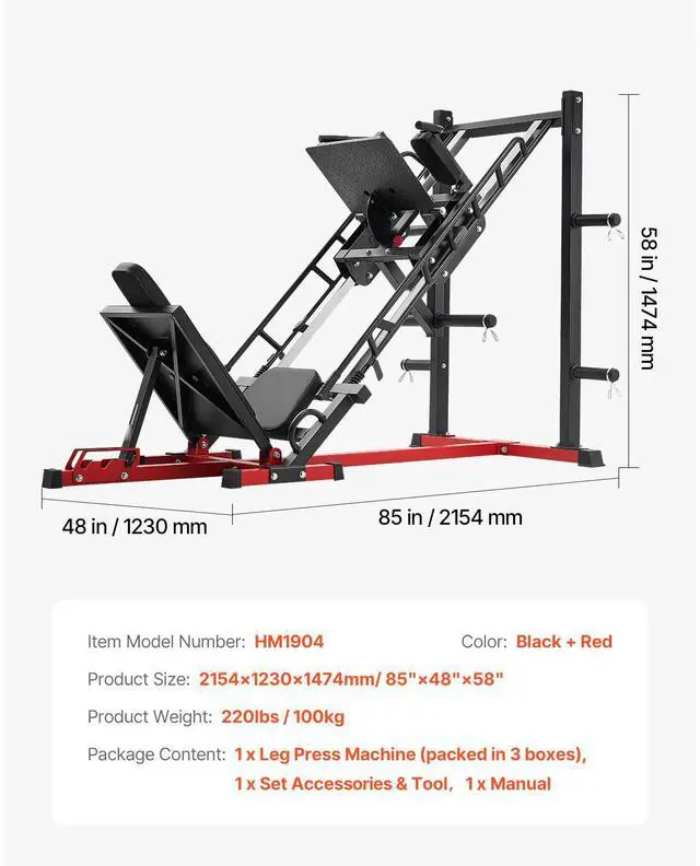 Detachable Backrest: Support ,Safety Limiter Adjustment: 4 Levels (0 / 7in / 14in / 21in) ,Footplate Adjustable Angle: 0°/ 90° ,Backrest Size: 27x12x2 inch / 700x300x50 mm,Color: Black + Red ,Item Model Number: HM1904,Product Weight: 220 lbs / 100 kg±3%,Material: Carbon Steel,Hack Shoulder Size: 9x4x2 inch / 240x100x50 mm,Cushion Size: 16x12x2 inch / 400x300x50 mm,Backrest Adjustment: 3 Levels (40°/ 45°/50°) ,Product Size: 85x58x48 inch / 2154x1474x1230 mm