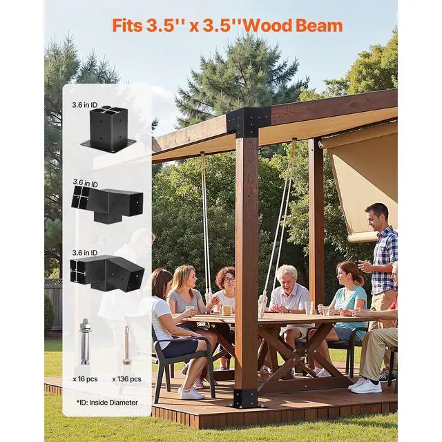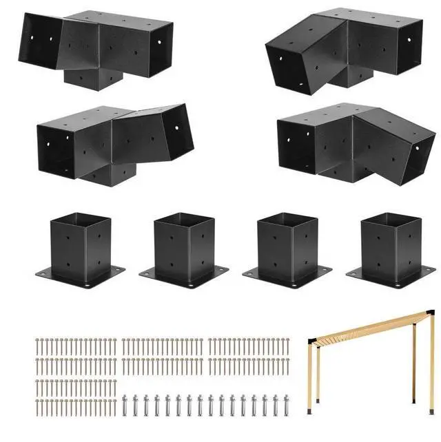 VEVOR Pergola Kit, 4x4 Inch 3-Way Slanted Bracket for 3.5x3.5 Inch Wood Beams in Actual Size, Carbon Steel Pergola Bracket with Screws and Post Bases, for Outdoor Wood Pergolas, Gazebos, Sheds, 8 Pcs