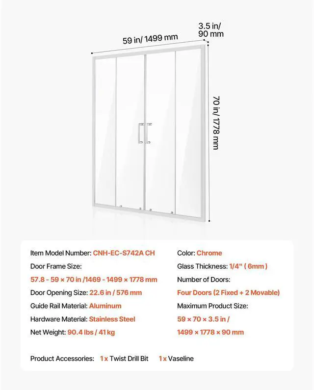 Door Frame Size: 57.8 -59 x 70 in/1469-1499 x 1778 mm